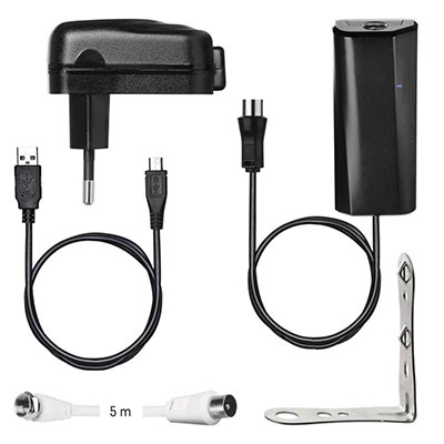 Antela se napaja z univerzalnim adapterjem USB, ki omogoča uporabo antene tudi tam, kjer ni omrežne napetosti 230 V. Adapter je priložen v paketu, prav tako koaksialni kabel.