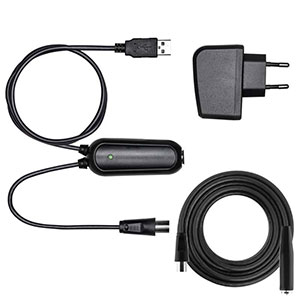 Želite anteno uporabljati tudi na mestih brez omrežne napetosti 230 V, na primer v avtodomu ali na dopustu na ladji? Brez težav. Antena se napaja s pomočjo adapterja USB, ki omogoča njeno napajanje povsod, kjer je dostopno napajanje preko USB priključka. Antena se dobavlja vključno z napajalnim virom v obliki USB kabla skupaj z napajalnikom USB. Sestavni del seta je tudi koaksialni petmetrski kabel, opremljen s priključki, ki olajša namestitev antene. Za napajanje lahko uporabite tudi USB priključek neposredno na TV ali digitalnem sprejemniku.