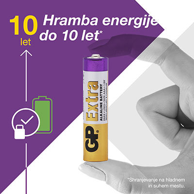 GP baterije linije EXTRA so odličen rezervni vir energije. V primerjavi z navadnimi baterijami za enkratno uporabo, za katere se priporoča shranjevanje za obdobje največ 5 let, so baterije GP EXTRA AAA zasnovane tako, da svojo najvišjo razpoložljivo energijo ohranijo pet let dlje. Tudi po desetih letih shranjevanja vam ni treba skrbeti, da njihova vzdržljivost ne bi bila zadostna.