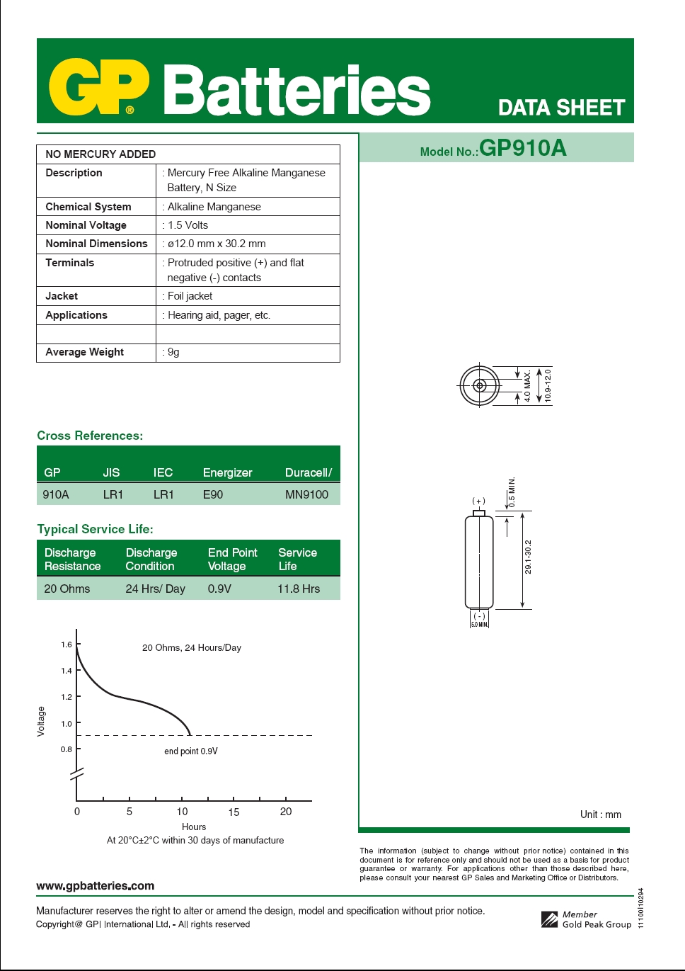 | tipska oznaka | GP 910A (N, LR1) |