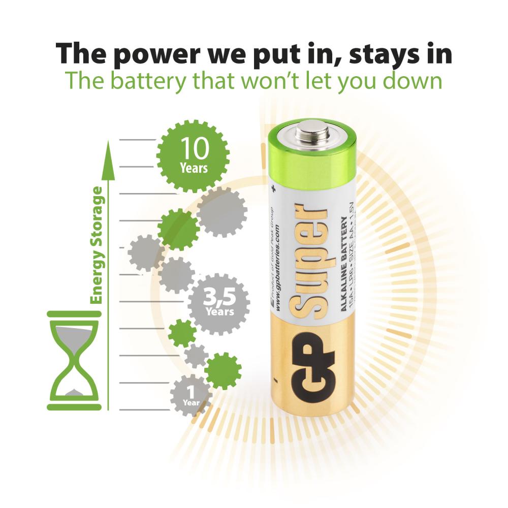 Baterije za enkratno uporabo je običajno priporočeno shranjevati najdlje 5 let. Potem že izgubljajo svojo vzdržljivost in povečuje se nevarnost iztekanja. Alkalne baterije GP vam v stanju kot nove zdržijo 2 leti dlje.