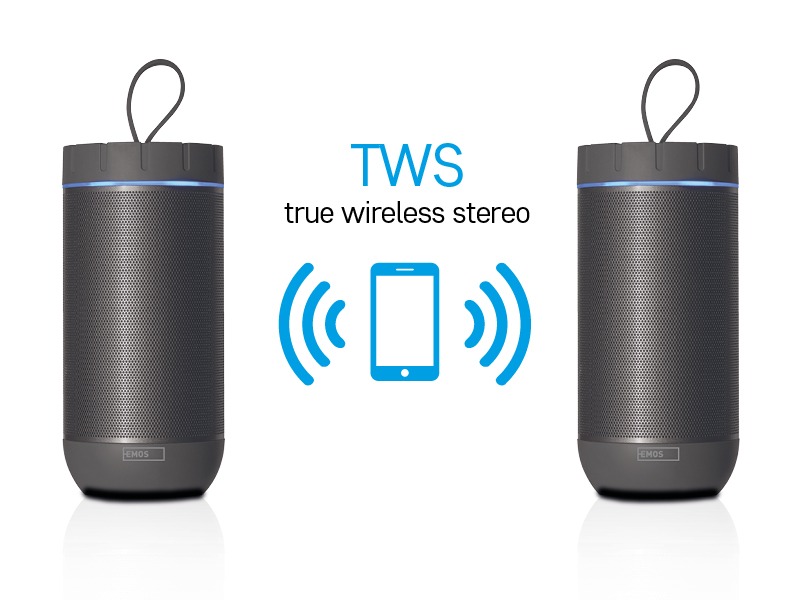 Valjast brezžični zvočnik EMOS odlikuje funkcija TWS (True Wireless System), ki z eno napravo omogoča povezati 2 SOUNDBOSSA. S tem se zvok razdeli v 2 samostojna avdio kanala in na vsaki zabavi ali solo dogodku vam ponudi edinstveno glasbeno doživetje.