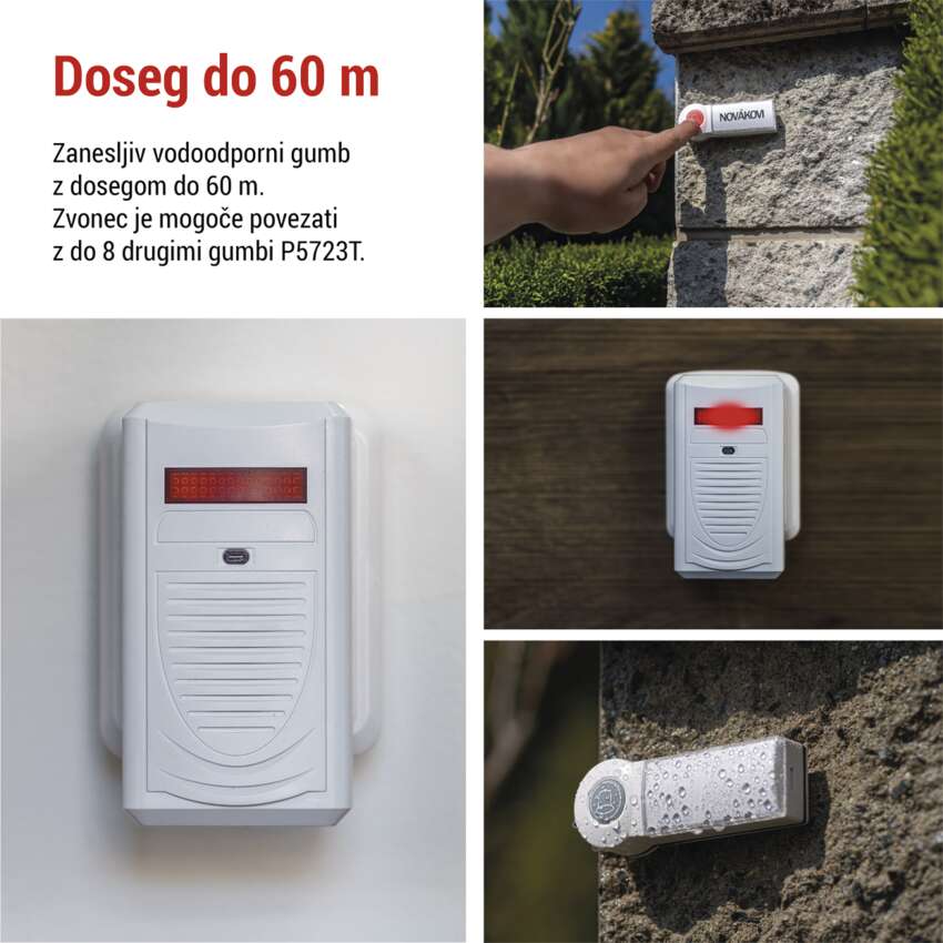Gumb zvonca lahko postavite na vhodna vrata, na vrata ali celo na ograjo. Potrebujete le, da je zvonec oddaljen največ 60 m od baze zvonca.