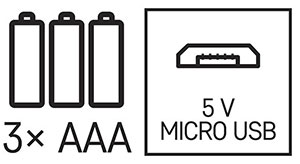 Napajanje z baterijami AAA (alkalne, ki jih ni mogoče ponovno napolniti) ali s 5V kablom mikro USB. Priključek mikro USB je eden najpogosteje uporabljenih priključkov USB, vendar prek njega ne morete polniti vstavljenih baterij.