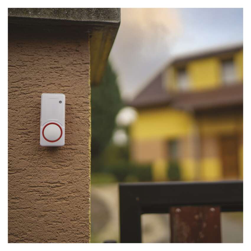 Tipka zvonca je vodoodporna, saj ima zaščito IP44. Namestite jo lahko na vrata ali v bližino vrat. Komplet notranje enote in zunanje tipke ima tako imenovano funkcijo "samoučenja" - zvonec lahko ustvari lastno kodo za seznanjanje, ki jo tipka sprejme in shrani v svoj pomnilnik. Komplet na podlagi te funkcije lahko razširite z dodatnimi tipkami.