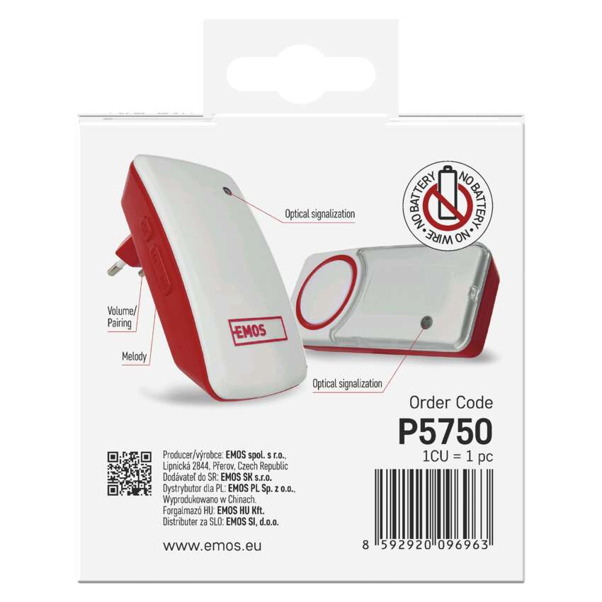 Sodoben in eleganten model zvonca blagovne znamke EMOS je odlična izbira. Brezčasna bela barva v kombinaciji z moderno rdečo barvo je tisto, zaradi česar je ta zvonec tudi vizuelno zelo privlačen. Oblikovno in tehnično izvedbo so zasnovali naši strokovnjaki na Češkem (EU).