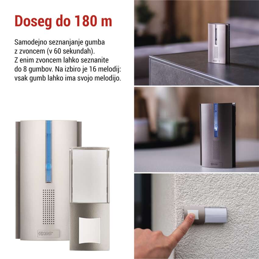 Sodoben brezžični zvonec, ki zagotavlja kombinacijo elegantne oblike, brezhibnih funkcij in tehnologije, na katero se lahko zanesete. Z vgrajenim ponavljalnikom signala in dosegom do 180 metrov lahko poveže vaš dom, vrt, garažo in oddaljena vrata - brez žic, brez težav.