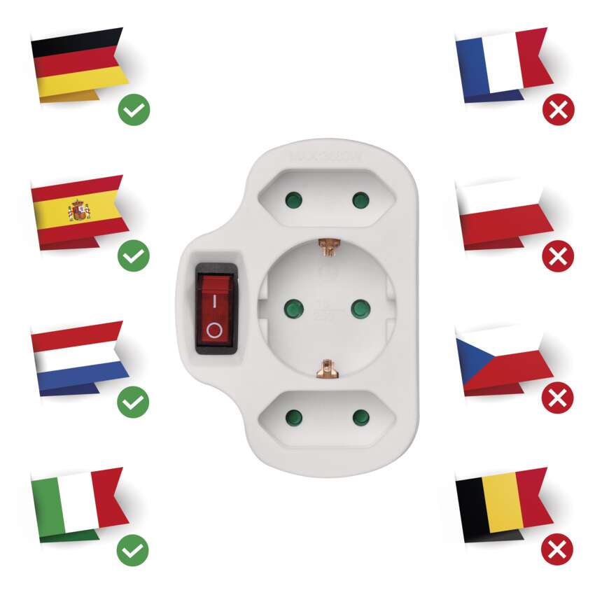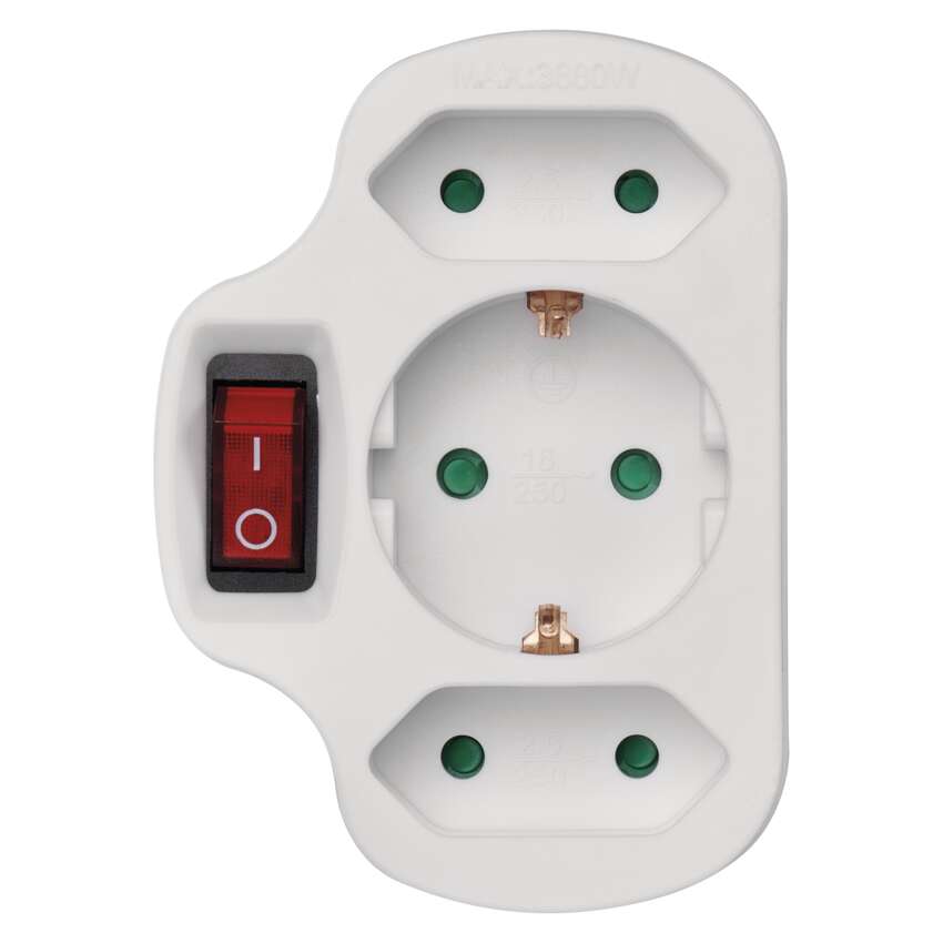 Praktična razdelilna vtičnica SCHUKO v beli izvedbi s stikalom. S pomočjo te vtičnice napajalno omrežje 250V~ razdelite in enostavno priključite več aparatov glede na določeno število vtičnic.