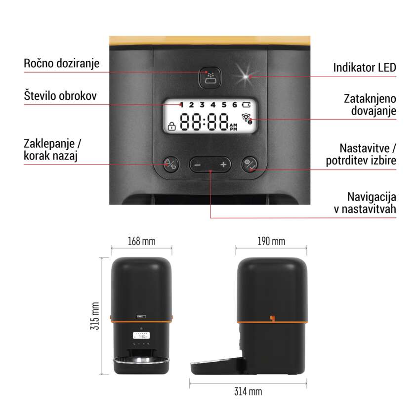 Nastavite posamezno hrano na število obrokov točno po potrebah vašega hišnega ljubljenčka. Velikost posameznega obroka je 5 gramov. Hranilnik vključuje tudi kazalnik stanja hrane v dozirniku. V primeru nizke ravni hranilnika bo na zaslonu utripala dioda, ki vas bo opozorila, da je treba ponovno napolniti brikete.