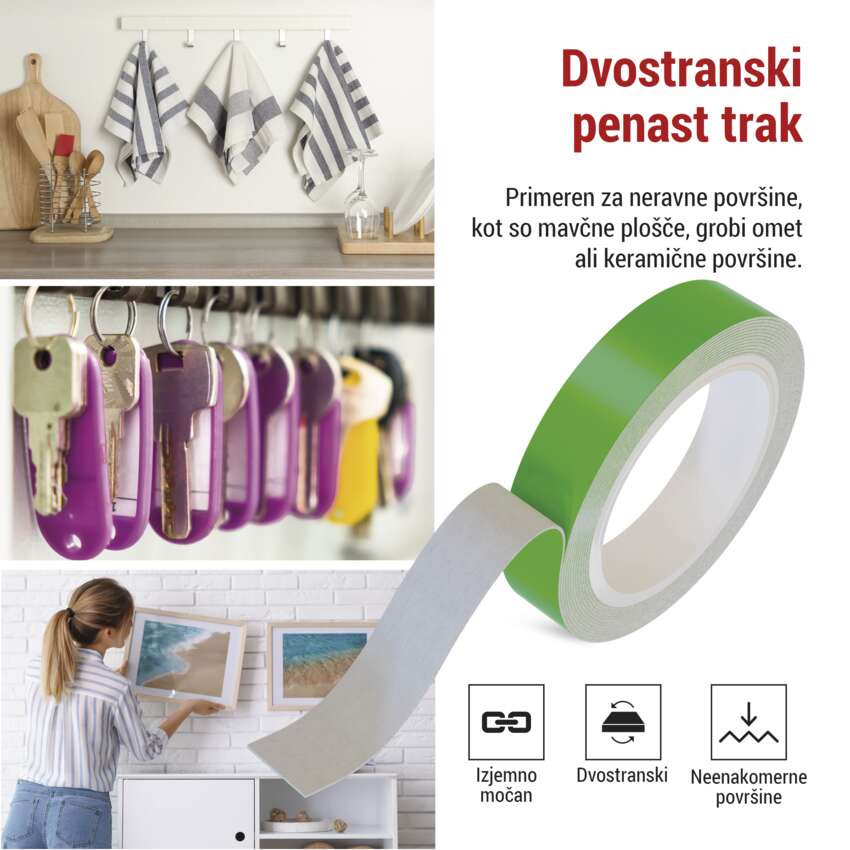 Kakovostni obnovljivi lepilni trak iz pene lahko uporabite na večini površin, ki se ne valjajo ali luščijo, kot so grob omet, suhomontažni zid, keramične ploščice, steklo, les, kovina itd. Trak je na obeh straneh prevlečen z akrilnim lepilom, zaradi česar je odlično lepilo za notranjo in zunanjo uporabo. Zaradi debeline 1 mm je primeren material tudi za izravnavo neravnin, oblazinjenje ali absorpcijo vibracij in dušenje zvoka. Primeren je za obešanje lahkih predmetov, vendar lahko brez strahu pred padcem prenese tudi težje predmete, kot so ogledala ali informacijski ali reklamni napisi.