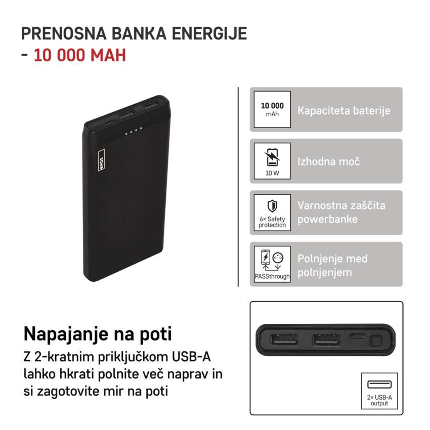 Ne glede na to, ali imate najnovejši mobilni telefon ali starejši model, ga boste lahko uspešno napolnili. Power banka EMOS Alpha 10S je opremljena z dvema izhodoma USB-A in priključkom za mikro USB. Priloženi kabli omogočajo tudi prenos podatkov, zato bodo prišli prav, ko boste fotografije s svojega mobilnega telefona ali fotoaparata prenesli na računalnik.
