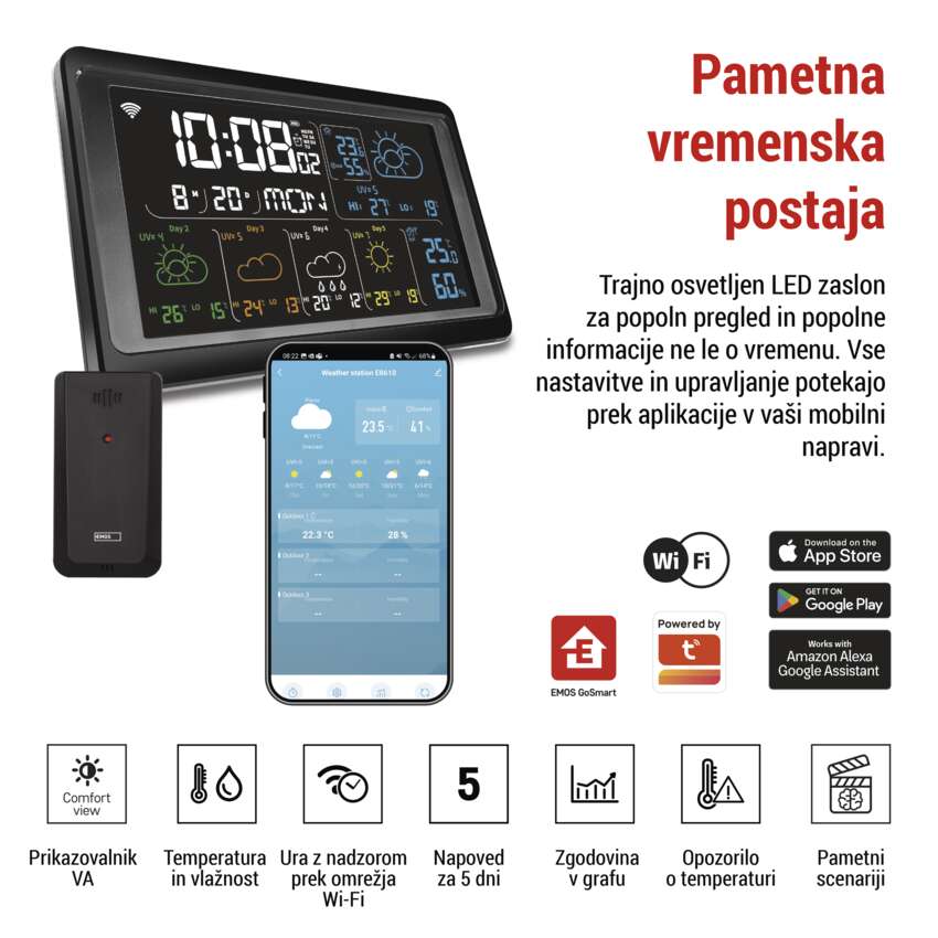 Priključite E8610 na svoje omrežje Wi-Fi in ga nadzorujte z mobilno aplikacijo EMOS GoSmart, ki je na voljo za Android in iOS. Zaradi protokola Wi-Fi-Fi, ki se prek usmerjevalnika poveže z internetom, lahko uresničite oddaljeno upravljanje in spremljanje svojih naprav. Napajanje vremenske postaje zagotavlja omrežni adapter, ki je vključen v paketu.