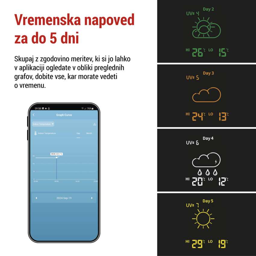 Vremenska postaja podpira do 3 izhodne senzorje, ki jih lahko namestite na 3 različne lokacije, njihove vrednosti pa lahko nato spremljate v mobilni aplikaciji v obliki preglednih grafov ali pa te vrednosti izvozite v datoteko Excel.