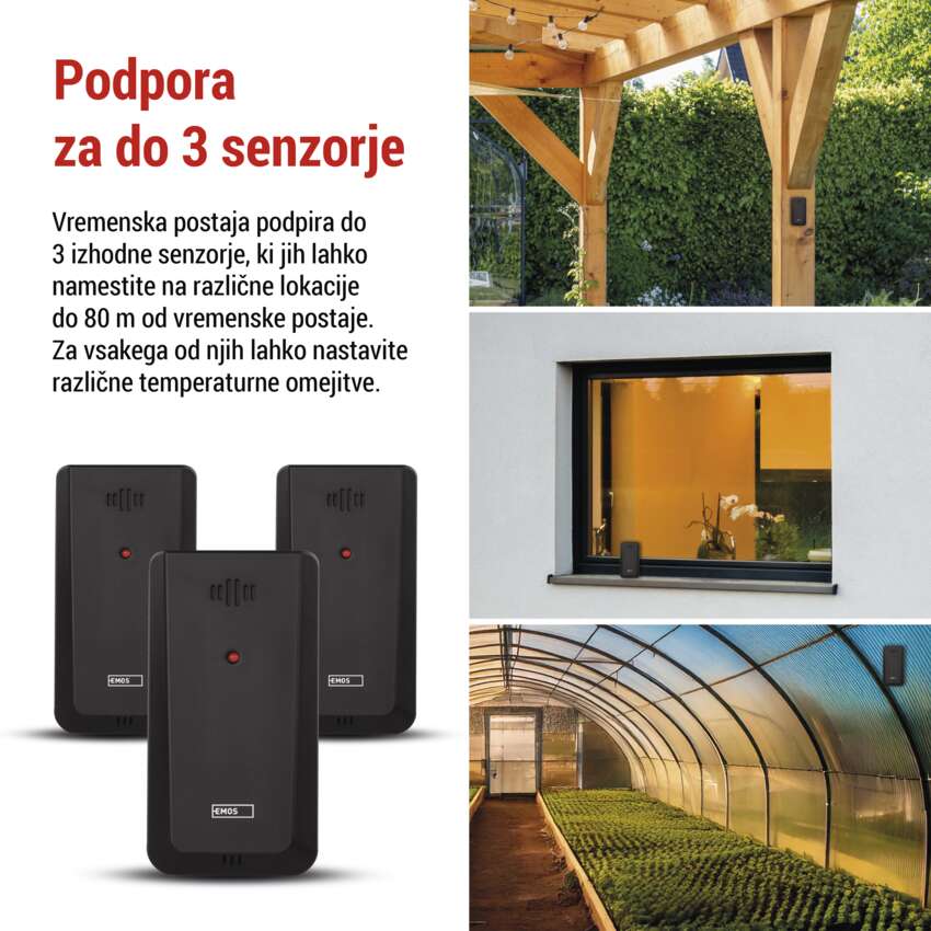 Velika prednost pametne vremenske postaje je podpora do 3 izhodnih senzorjev, ki jih lahko namestite na 3 različne lokacije. Vključen je en zunanji senzor, ki ga lahko namestite tako v notranjosti kot na prostem. Doseg senzorjev od glavne postaje je do 80 m, napajajo pa se z 2×1,5V baterijami AAA, ki niso priložene. Spremljajte na primer temperaturo ali vlažnost v rastlinjaku ali vinski kleti.