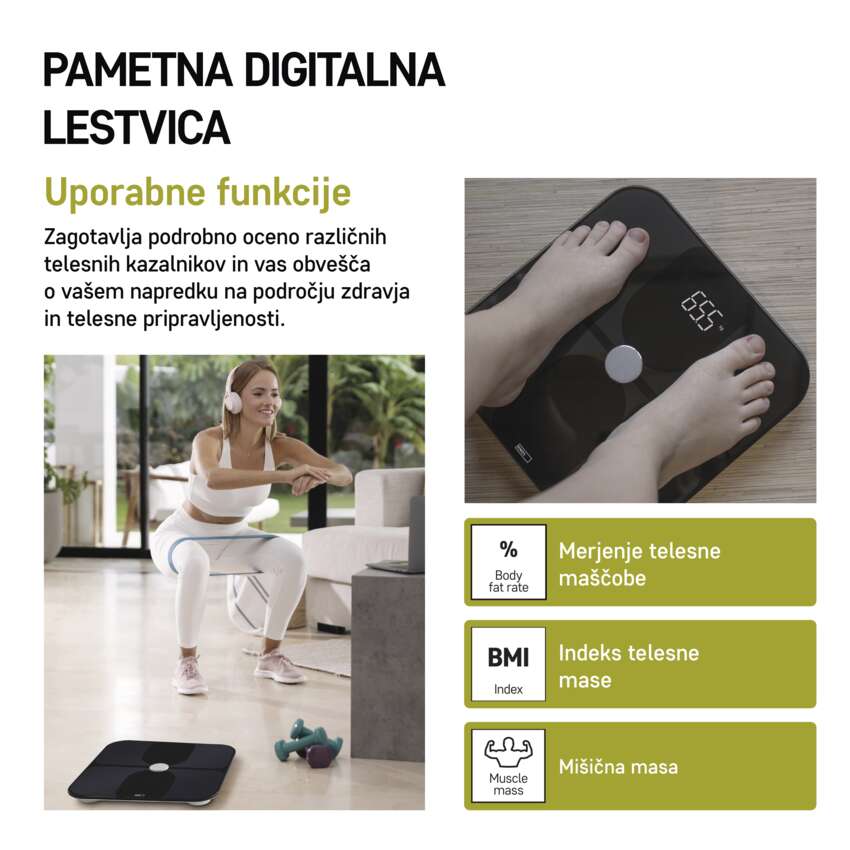 Poleg osnovnega merjenja telesne teže lahko na primer oceni BMI(indeks telesne mase), količino telesne maščobe v telesu, delež mišične mase, indeks telesne maščobe, stopnjo debelosti, priporoča vašo idealno težo in zbirno oceni izgubljene ali pridobljene kilograme. Ti kazalniki vam bodo pomagali dobiti natančno sliko o vašem telesu in vam zagotovili dragocene informacije za načrtovanje prehrane in vadbe.