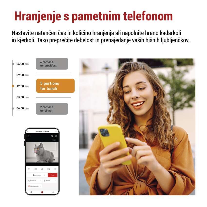 Morate od doma ali ste se zadržali v službi in ne morete pravočasno nahraniti svojega ljubljenčka? Naš pametni hranilnik lahko v celoti reši vaše težave s hranjenjem in zagotovi svež obrok briketov po natančno določenem urniku. Zahvaljujoč nagibni vgrajeni kameri (2 MPx) in zaznavanju gibanja boste lahko videli tudi, ali je vaša mačka ali pes prišel do sklede. Privoščite svojemu hišnemu ljubljenčku zdrav in srečen življenjski slog.