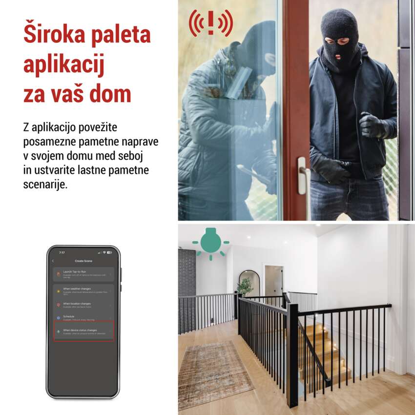 Senzor gibanja GoSmart lahko uporabljate glede na svoje potrebe. Postavite ga ob stopnišče in ko zazna gibanje, avtomatsko vklopi osvetlitev LED na svojem območju. Ali pa ga priključite na sireno in nepovabljenim obiskovalcem takoj sporočite, da so kršili vašo zasebnost.