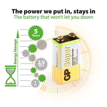 Kakovostna konstrukcija baterij in dragocen know-how GP specialistov zagotavljajo, da vam tudi po 5 letih shranjevanja v predalčku te baterije za enkratno uporabo ponudijo 100 % svoje energije.