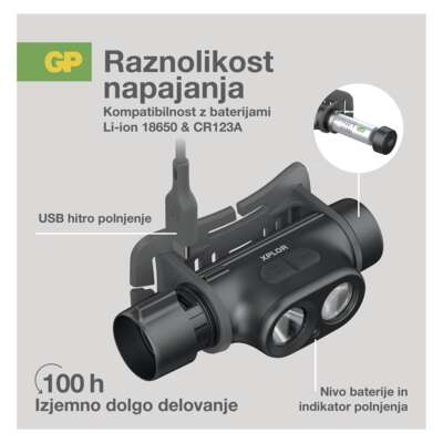 Vsaj svoj prosti čas preživljate na prostem? Ste ljubitelj športov na prostem? Se vzpenjate po strmih gorskih verigah, iščete skrivališča, raziskujete jame, se s kolesom ali peš odpravljate na dolga potovanja po gorskih verigah in je vaš šotor vaš drugi dom? Potem veste, da zanesljiv in vzdržljiv vir svetlobe ne sme manjkati pri nobeni taki dejavnosti. Eden takih je LED naglavna svetilka GP Xplor PHR19. Ta zmogljiva in vzdržljiva čelna svetilka ima dva neodvisno nadzorovana svetlobna vira, ki zagotavljata točkovno in prostorsko osvetlitev.Zaradi visoke stopnje vodoodpornosti lahko preživi potopitev v globino do 2 m. Zaradi superhitrega polnjenja prek priključka USB-C vas ne bo pustil na cedilu med katero koli zahtevno dejavnostjo na prostem.