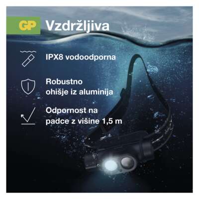 Narava postavlja človeku na pot številne pasti. Če jih želite preživeti brez poškodb, jih mora preživeti tudi vaša čelna svetilka, še posebej ponoči. GP Xplor PHR19 je izdelan iz aluminija v kombinaciji s plastiko ABS in lahko preživi padec z višine do 1,5 metra. Tudi brodenje v globokem potoku ali reki ni težava. Meja bo prej vaš pogum. Ima zaščito IPX8, zaradi katere ga lahko potopite do 2 m. Zaščiteni so vsi njeni kritični deli, zlasti vrata za polnjenje USB.