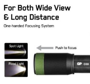 V osnovnem položaju nudi ročna svetilka GP C33 širok stožec svetlobe krajšega dometa, ki je primeren za delo. Kadar pa z eno roko izvlečete njen prednji del, se stožec svetlobe zoži in vi v primeru potrebe posvetite na razdaljo do 100 m.