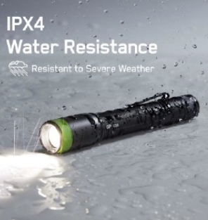 Kadar vas med delom zunaj preseneti dež, pri miru končajte, kar morate. Baterijska svetilka je varovana z zaščito IPX4, ki zagotavlja, da prenese napad brizgajoče vode iz vseh smeri.