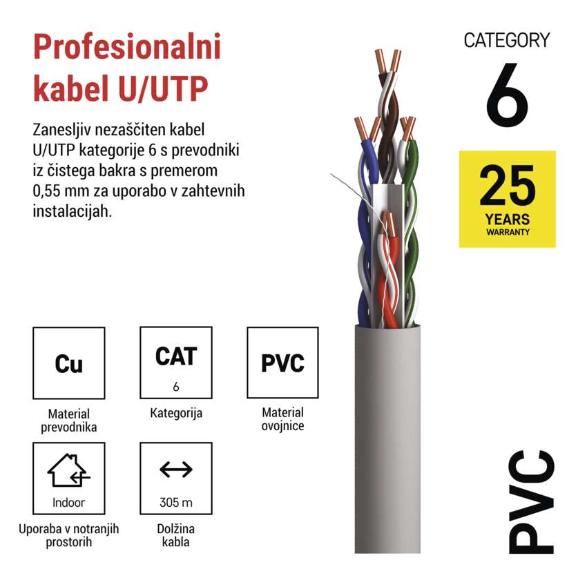 Nezaslonjen horizontalni kabel najvišje kakovosti kategorije CAT6 s PVC plaščem. Jedra vodnikov so izdelana iz čistega bakra. Kabel ustreza zahtevam direktive CPD o gradbenih proizvodih.