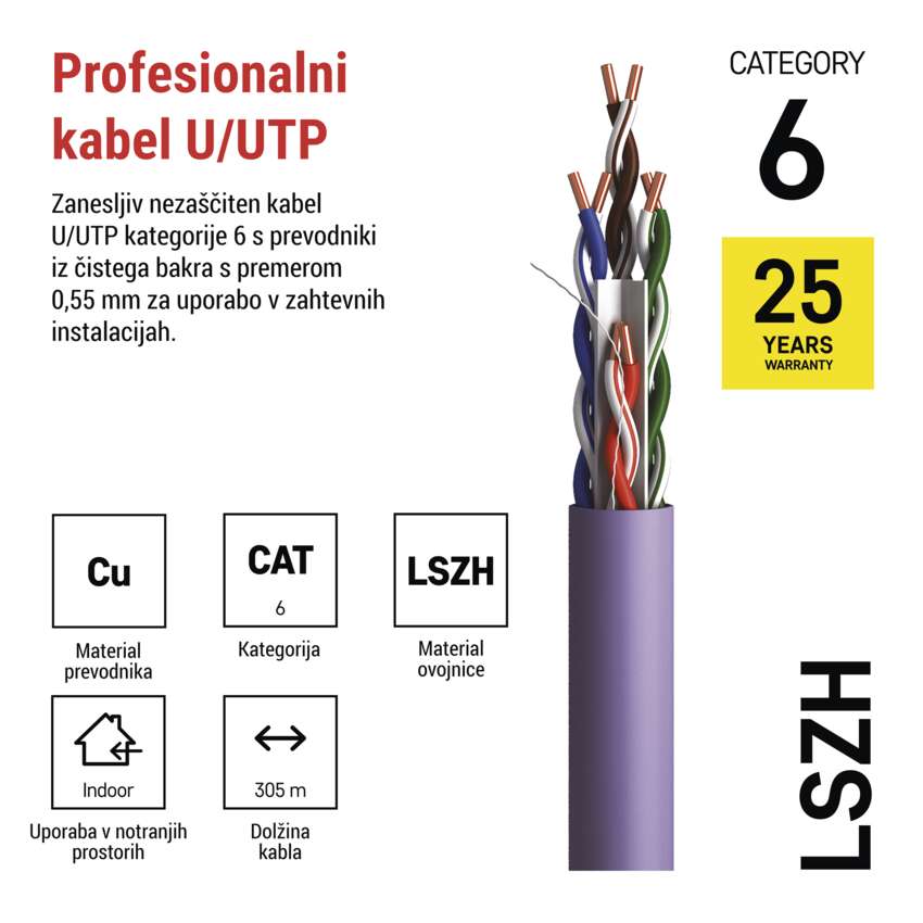 Nezaslonjen horizontalni kabel najvišje kakovosti kategorije CAT6 z LSOH (LSZH) plaščem. Jedra vodnikov so izdelana iz z čistega bakra. Kabel ustreza zahtevam direktive CPD o gradbenih proizvodih.