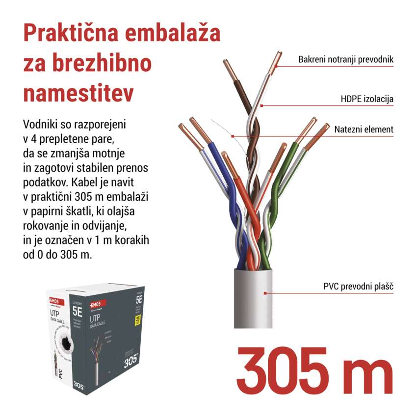 Nezaslonjen horizontalni kabel najvišje kakovosti kategorije CAT5E s PVC plaščem. Jedra vodnikov so izdelana iz čistega bakra. Kabel ustreza zahtevam direktive CPD o gradbenih proizvodih.