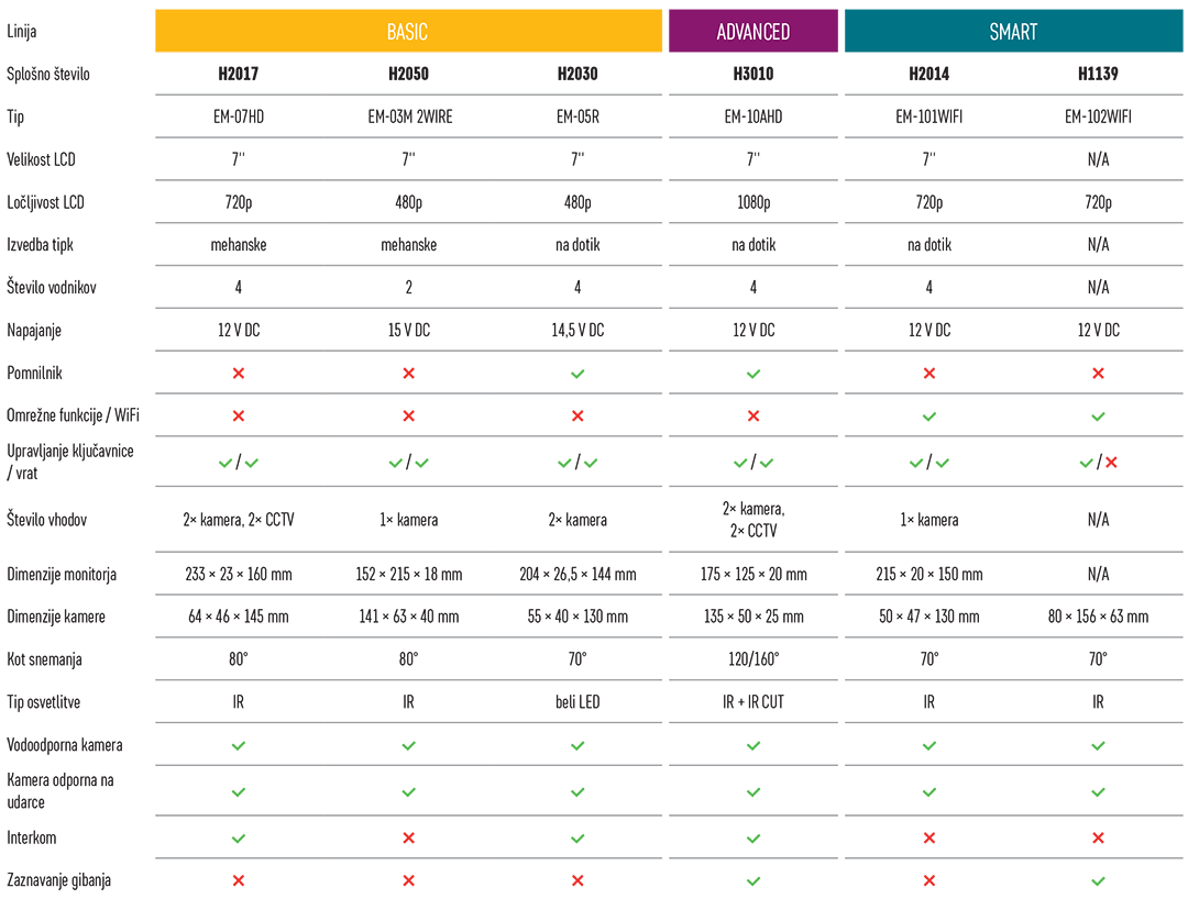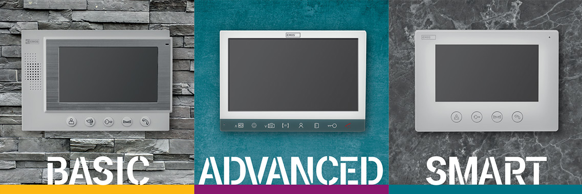 Skupna lastnost video domofonov linij BASIC, ADVANCED in SMART je notranja enota - 7“ barvni LCD zaslon. Modeli linije BASIC imajo ločljivost 480p ali 720p, model linije ADVANCED se lahko pohvali z visoko ločljivostjo 1080p, modeli v okviru SMART linije pa ponujajo ločljivost 720p.