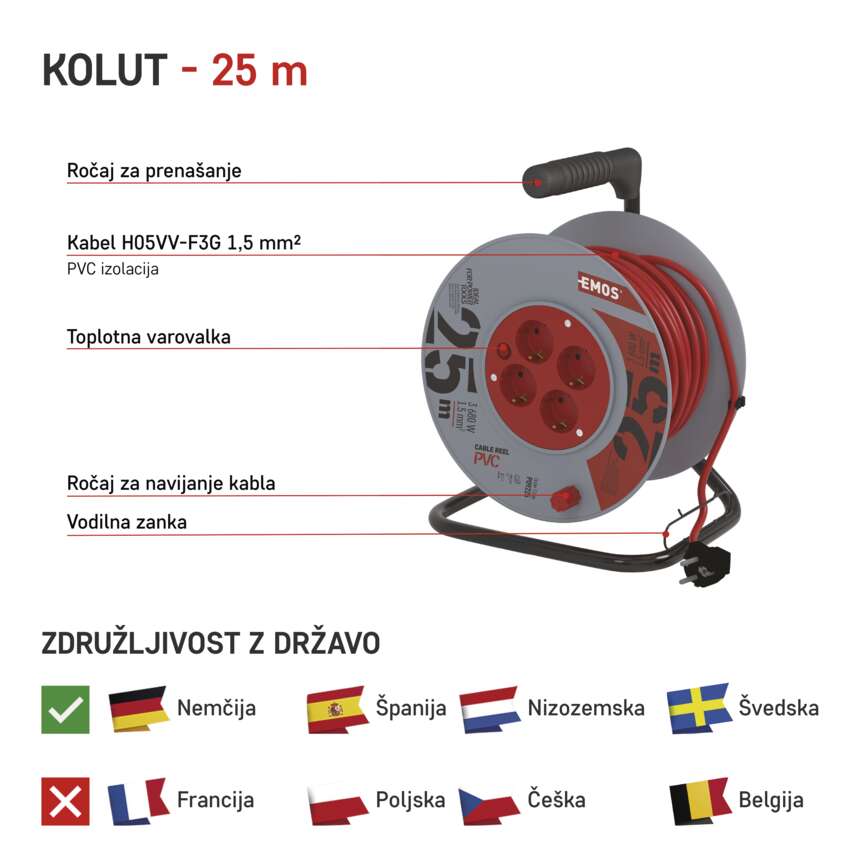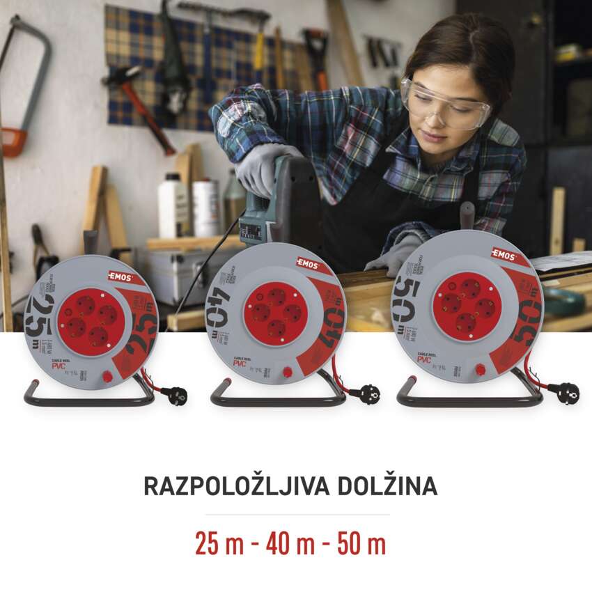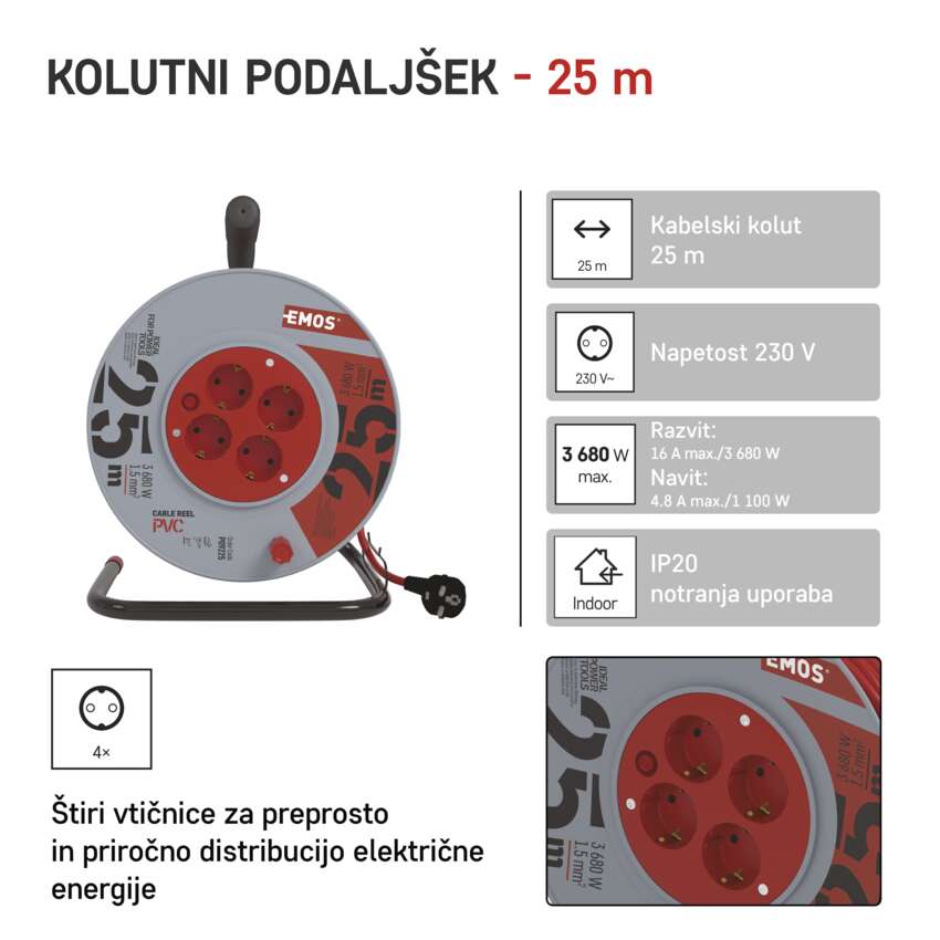 Kolutni podaljšek EMOS 25 m vam ponuja 4 vtičnice, termično varovalko, zavoro, tuljavo močne plastike ABS (odporna na nenamerne padce) in kovinski okvir.
