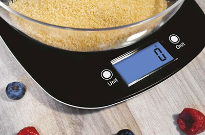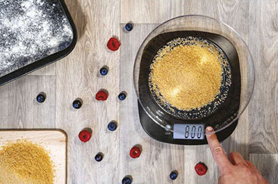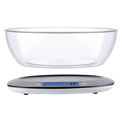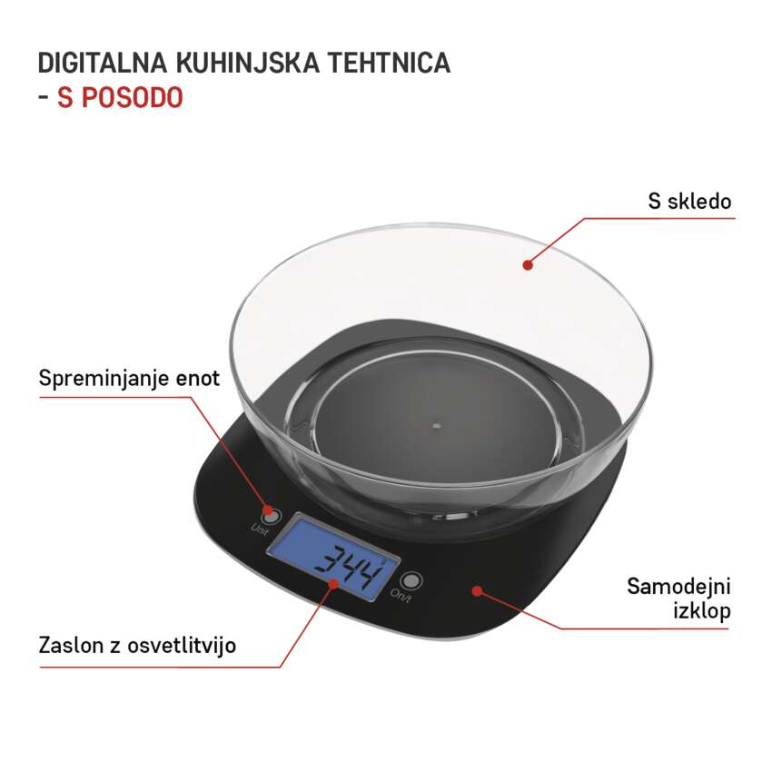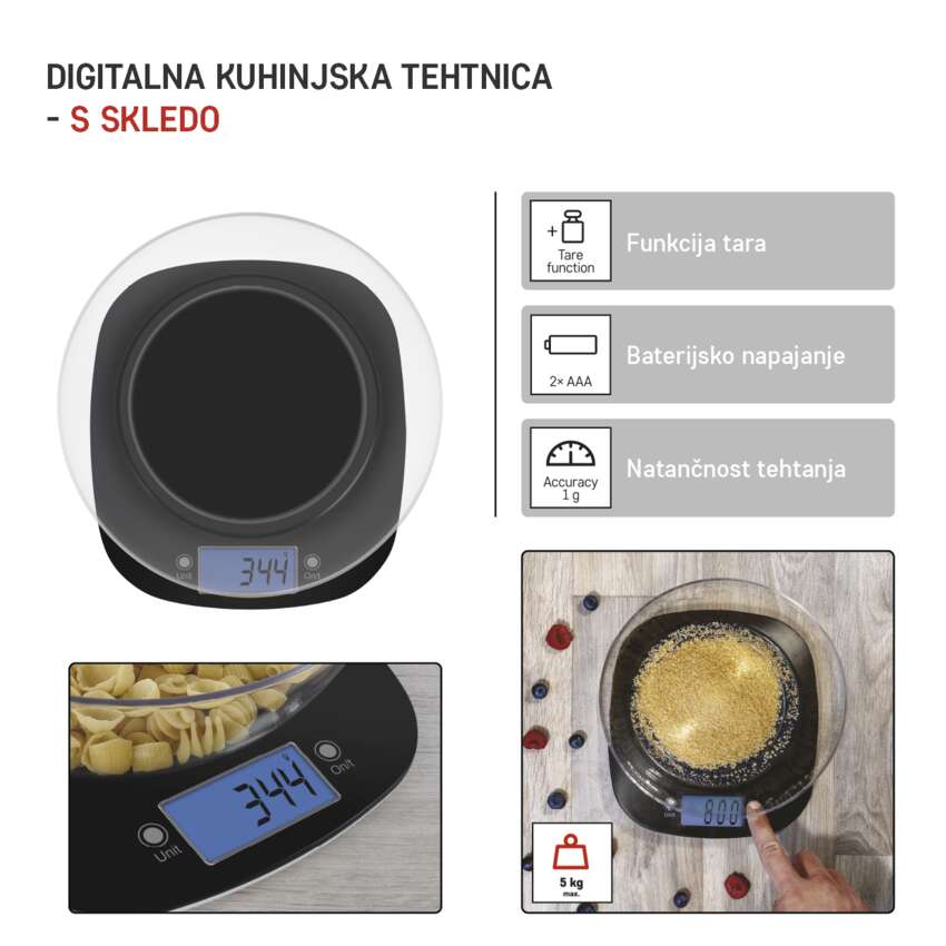 Tehtnica vključuje plastično skledo, v kateri lahko stehtate sladkor, oreščke, olje ali porcijo zelenjave. Površina tehtalne površine iz plastike ABS je oblikovana tako, da drži skledo in preprečuje njeno zdrsavanje. Hrano lahko tehtate tudi brez sklede neposredno na tehtalni površini ali pa uporabite na primer krožnik. Preprosta oblika tehtnice se prilega vsaki sodobni kuhinji. Če pogosto pečete, imejte tehtnico pri roki na kuhinjskem pultu.