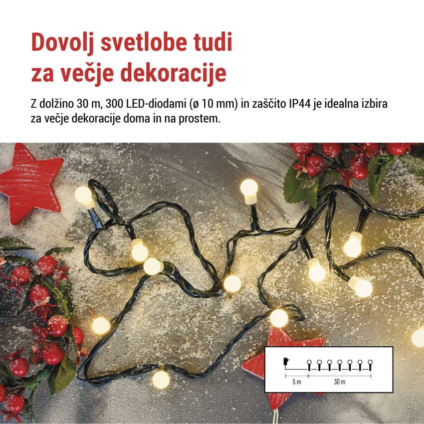 LED božična cherry veriga – kroglice, 30 m, zunan. in notran.,topla bela,programi,časovnik