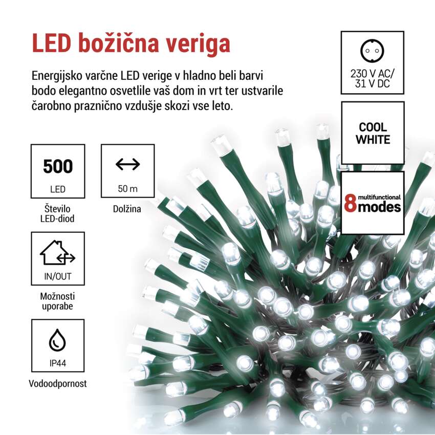 LED božična veriga, 50 m, zunanja in notranja, hladna bela, programi, časovnik
