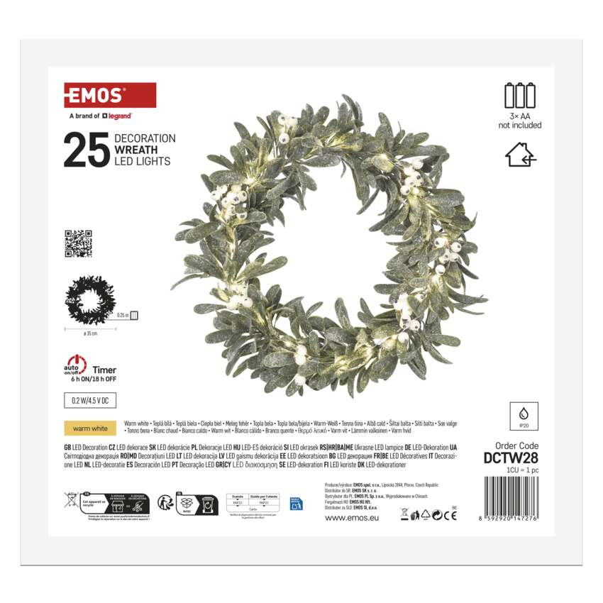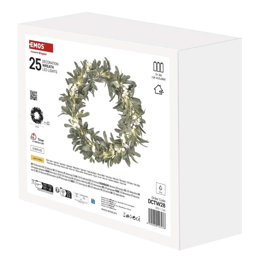 Vnesite čar božiča v svoj dom z elegantnim vencem LED z motivom omele. Venec ima premer 35 cm in 25 toplo belih diod LED. Je idealna izbira za okrasitev praznične mize, vrat, polic, oken ali prazničnih aranžmajev.