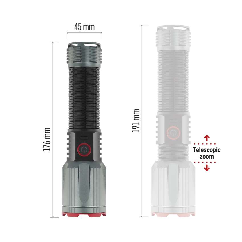 Nastavljiva povečava omogoča enostaven prehod z obsežne osvetlitve okolice na natančen točkovni snop. Idealno za dom, delo in nujne primere.