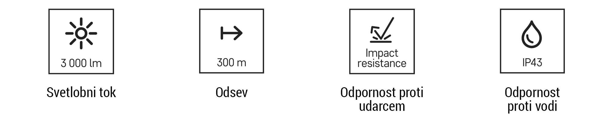 | svetlobni tok | LED BOOST – 3 000 lm, LED 100 % – 2 000 lm, LED 50 % – 1 000 lm, LED 20 % – 500 lm |