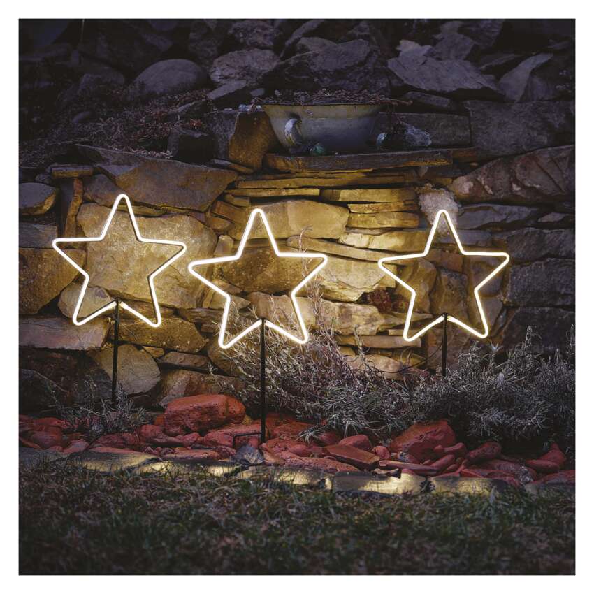 Kako na enostaven način ustvariti čarobno božično vzdušje na svojem vrtu, vrtu pred hišo, cvetlični gredi, okrasnem skalnjaku ali dovozni poti? Odgovor so bodeče zvezde, ki s svojo hladno belo svetlobo razsvetlijo sicer temne kotičke in vanje vnesejo pridih prazničnega vzdušja. Poleg tradicionalnega zabadanja v zemljo lahko to dekoracijo uredite tudi v lončkih ali vijih, na primer na balkonu. Zaradi dolgega 5 m napajalnega kabla je priključitev na električno omrežje enostavna.