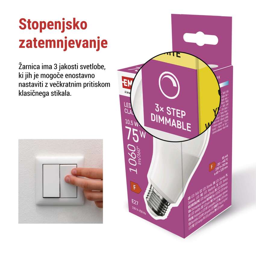 LED žarnica Classic A60 / E27 / 10,5 W (75 W) / 1 060 lm / toplo bela /stopenjsko zatemnit