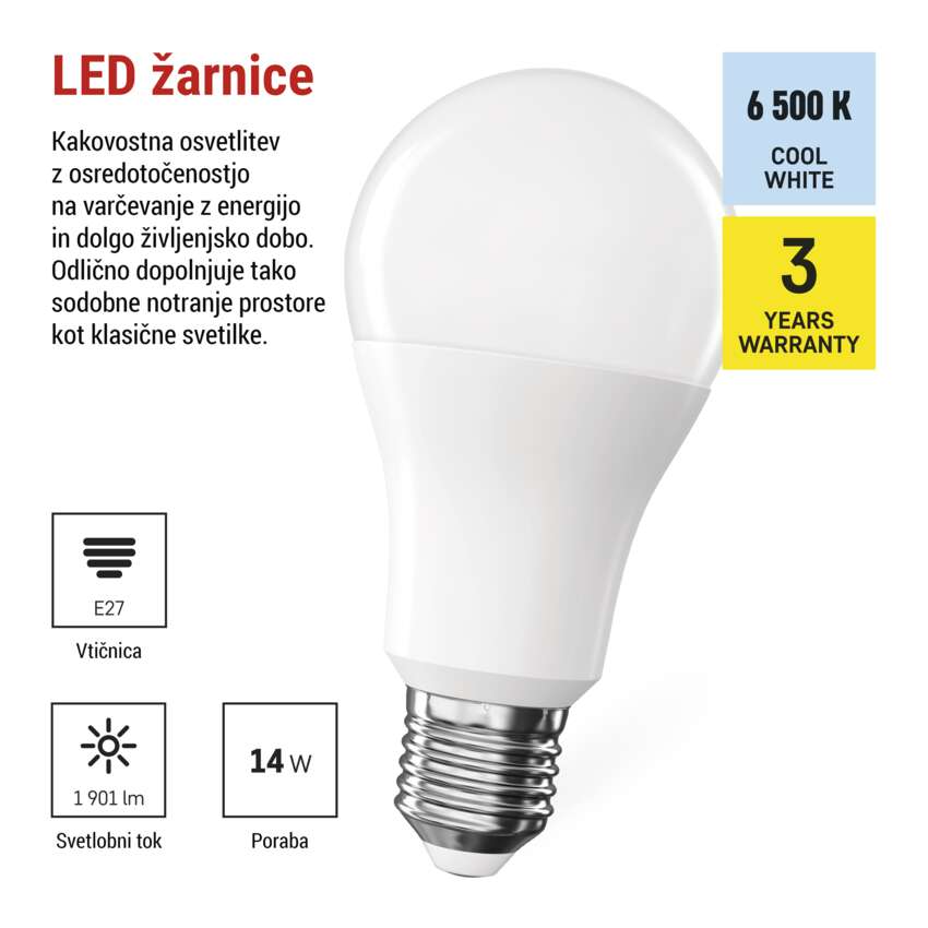 LED žarnica Classic A60 / E27 / 14 W (120 W) / 1901 lm / Hladna bela