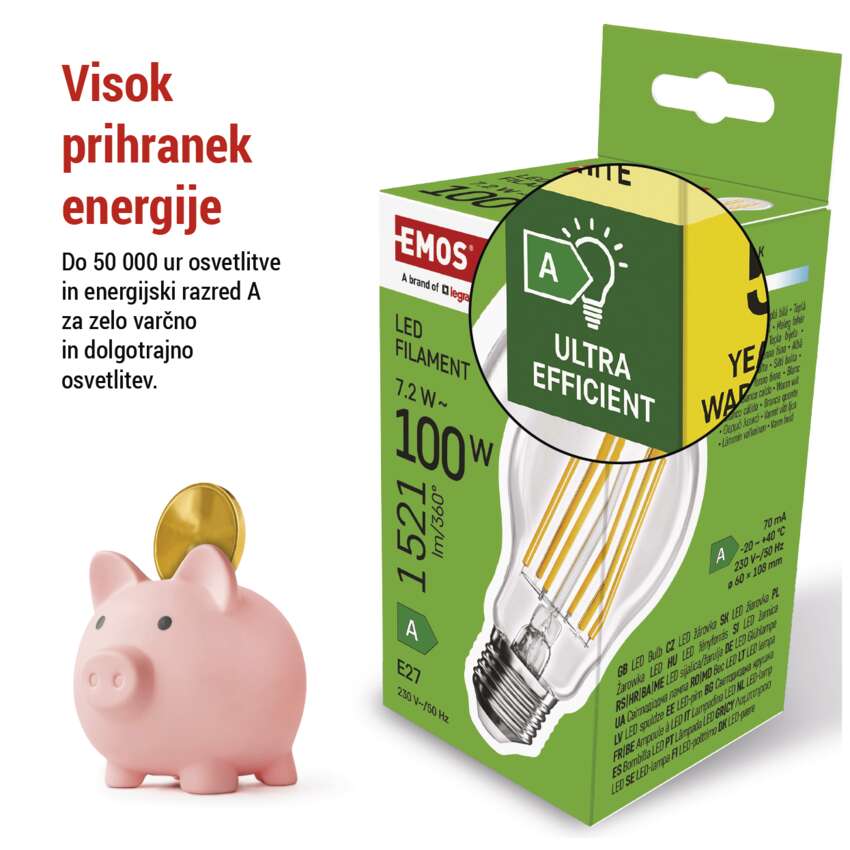 Linija ultra varčnih žarnic Filament so LED žarnice, ki združujejo sodobno tehnologijo LED in klasičen videz žarnic z nitko. Te žarnice so zelo učinkovite, okolju prijazne in imajo tudi dolgo življenjsko dobo do 50.000 ur, kar je dvakrat dlje od običajne razsvetljave. To pomeni, da jih boste morali redkeje zamenjati, s čimer ne boste prihranili le energije, temveč tudi denar.