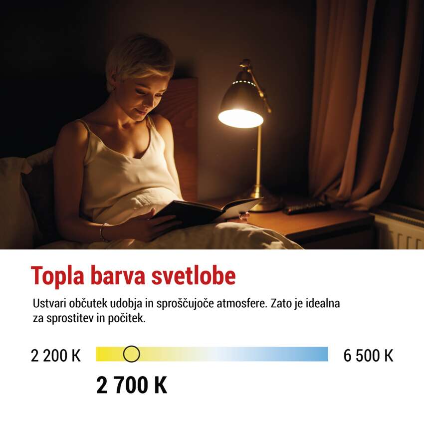 - Toplo bela svetloba je popolna za večerno sprostitev in sproščanje v dnevni sobi ali spalnici