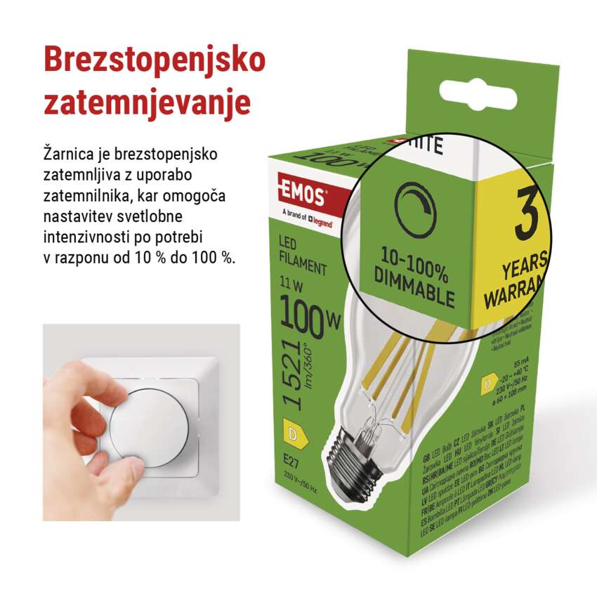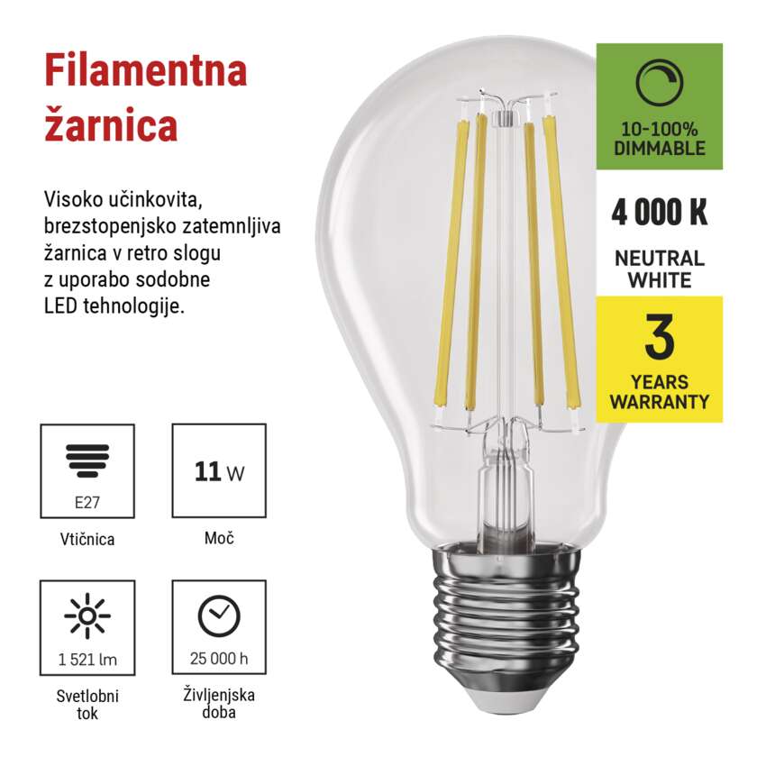 LED žarnica Filament A60 / E27 / 11W (100W) / 1521 lm / nevtralno bela / zatemnilna