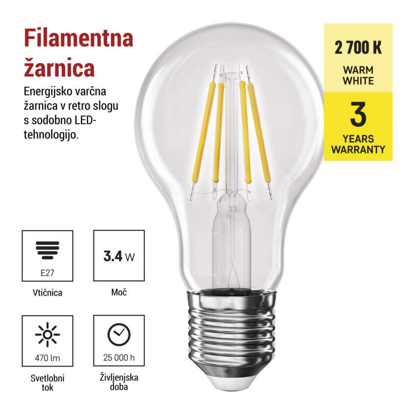 LED žarnica Filament A60 / E27 / 3,4 W (40 W) / 470 lm / Toplo bel