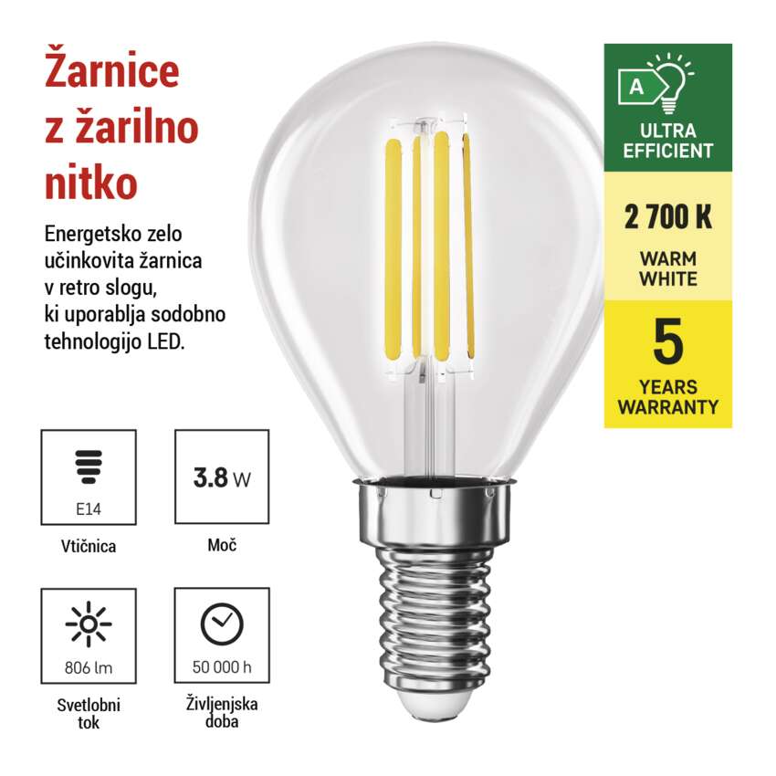 LED žarnica Filament Mini Globe A CLASS / E14 / 3,8 W (60 W) / 806 lm / toplo bela
