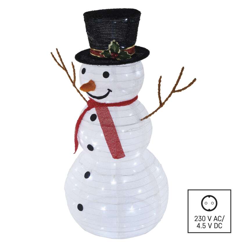 Izvirna zasnova zložljivega snežaka na prostem bo poživila vaš vrt, pergolo, teraso ali vrt pred hišo in jih spremenila v pravljične kotičke. hladna bela svetloba lepo izstopa v vseh vremenskih razmerah, zaradi zvišane vodoodpornosti pa se snežak lahko spopade z dežjem ali snegom. Njegova uporaba se ne konča pri zunanjih prostorih, z njim lahko okrasite tudi večje stanovanjske ali poslovne prostore v zaprtih prostorih. Zaradi dolgega 5 m napajalnega kabla je priklop v električno omrežje zelo enostaven.