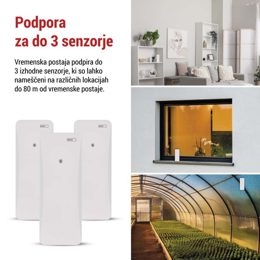 Zunanji senzorji, ki se napajajo z 2× baterijami AA, so lahko po potrebi nameščeni tako v zaprtih prostorih kot na prostem. Vključen je en senzor. Za vsak senzor lahko nastavite ločeno temperaturno mejo med -40 °C in +70 °C z ločljivostjo 1 °C.