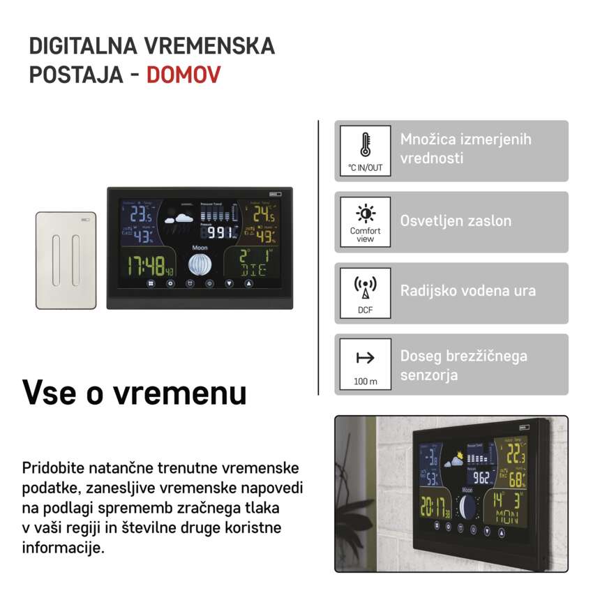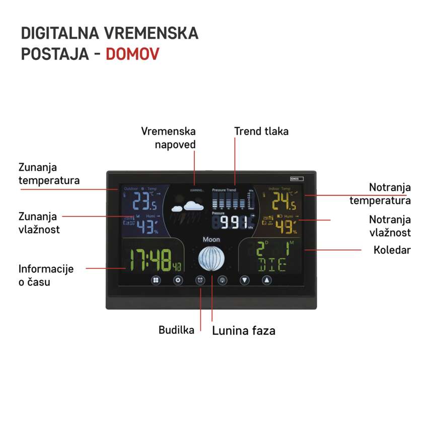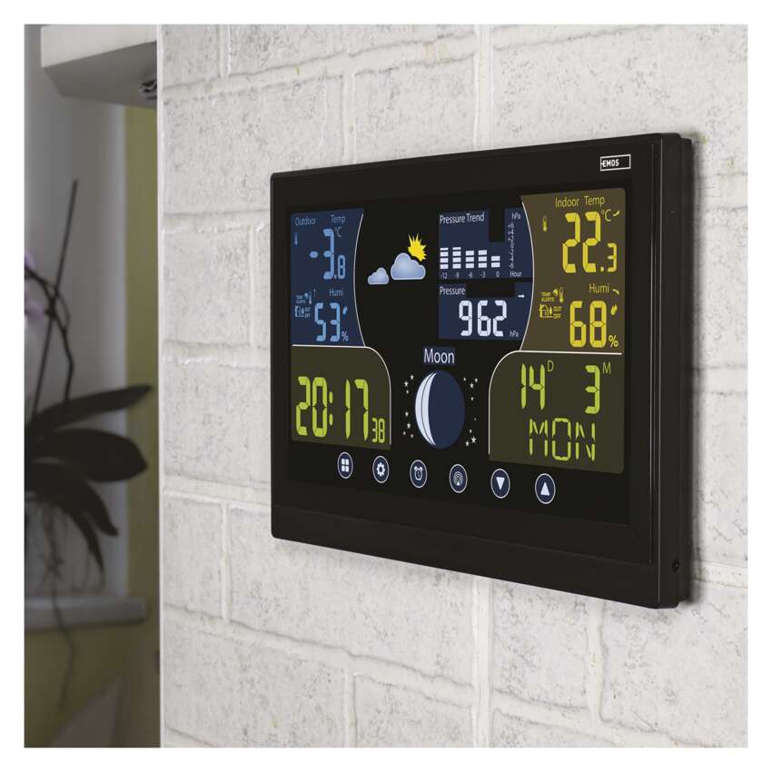 Če želite znati trenutno temperaturo doma in zunaj in želite vedeti, kakšno vreme vas v nekaj urah čaka, vam pride prav hišna vremenska postaja EMOS. S tem priročnim pomočnikom vas vreme ne bo nikoli presenetilo, še več, lahko se veselite še cele vrste praktičnih funkcij. Na barvnem zaslonu se vam poleg temperature v notranjosti in zunanjosti, vlažnosti ter tlaka prikazujejo tudi točen čas, ki ga vodi DCF signal, datum in koledar. Nič manj praktična funkcija je budilka s funkcijo dremež.
