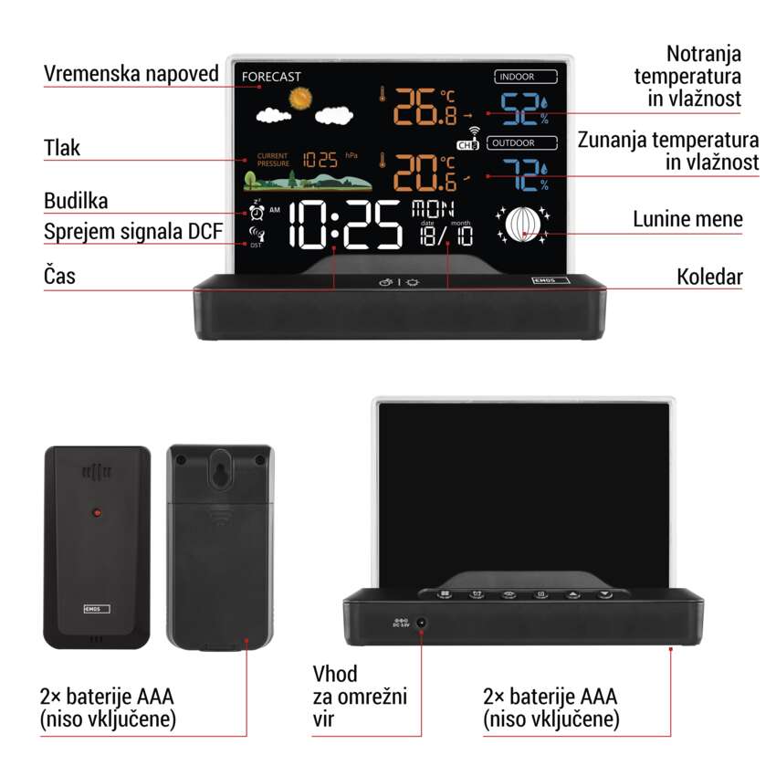 Trajno osvetljen LED VA zaslon vam ponuja boljši kontrast in najtemnejši odtenek črne. Zaradi tega je zaslon krasno čitljiv v vseh svetlobnih pogojih. Zaradi stilnega in sodobnega dizajna vremenske postaje bo ta postala notranji dodatek v vsakem domu. Vremenska postaja se stalno napaja z adapterjem ali 2× baterijami AAA, ki niso priložene.