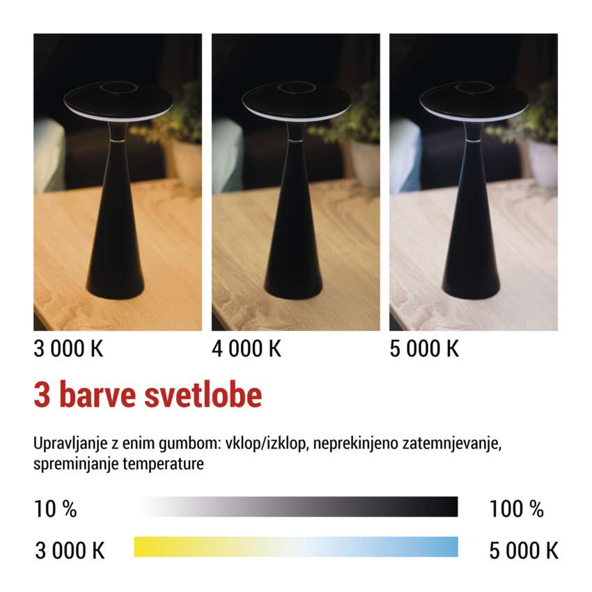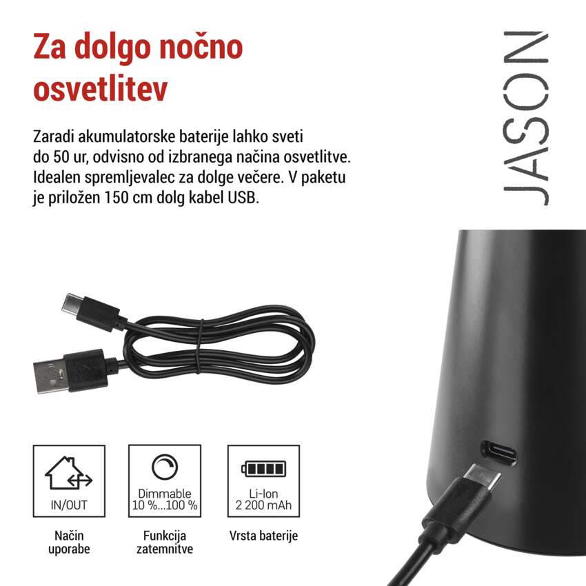 Z namizno svetilko JASON odkrijte popolno kombinacijo elegance in funkcionalnosti. Elegantna mat črna zasnova in možnost zatemnitve ustvarjata popoln ambient za vsako pisalno mizo ali nočno omarico. Zaradi odpornosti na vodo je ta svetilka idealna tudi za zunanjo uporabo, na primer na vaši verandi. Z izbiro tople, nevtralne in hladne bele barve svetlobe boste vedno našli pravo osvetlitev.